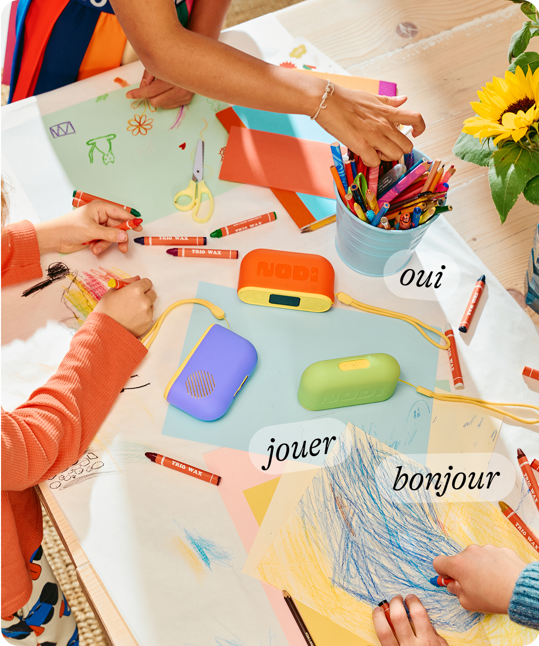 Sprachnachrichten senden & empfangen, entweder an andere Kinder mit einem NODI Flip oder an Erwachsene über die NODI Eltern-App (iOS/Android).